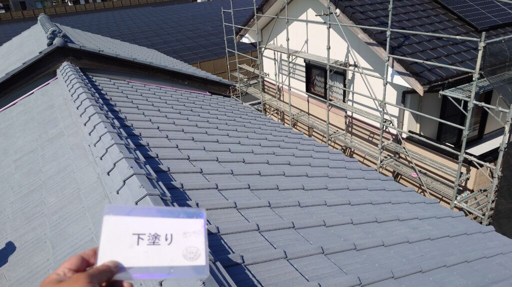 下地調整が終わったら、下塗りをしっかりと行います。下塗りは屋根材と塗料をつなぐ“接着剤”のような役割があり、ここでしっかりと塗膜を作ることで、上塗り塗料の性能が発揮されます。下塗りが不十分だと、せっかくの高性能塗料も本来の力を発揮できません。