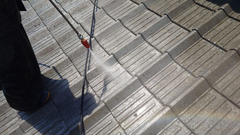 屋根塗装の仕上がりや耐久性を大きく左右するのが、高圧洗浄後の下地調整です。屋根は紫外線や雨風にさらされ続け、表面にはコケやカビ、古い塗膜、砂ぼこりなどが付着しています。まずは高圧洗浄でこれらの汚れをしっかり落とし、塗料がしっかり密着する状態を作ることが大切です。