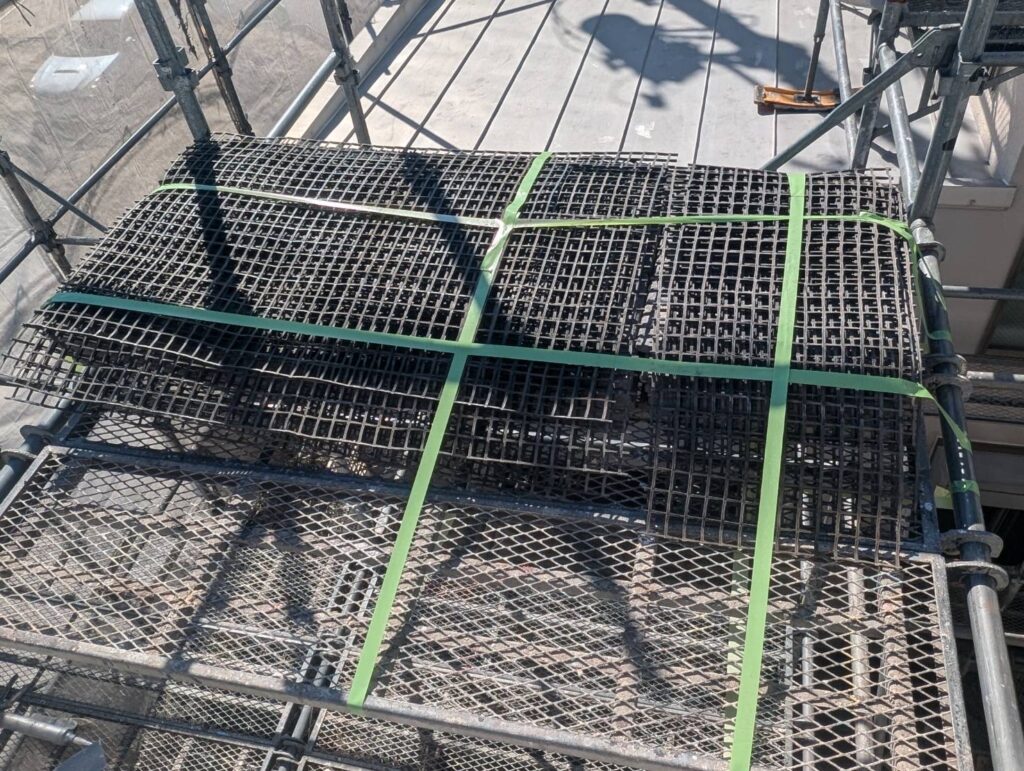 ガルバリウム鋼板の笠木や手摺り部分はサビる前の塗装が必要です。ケレン後、弱溶剤塗料にて塗装します。