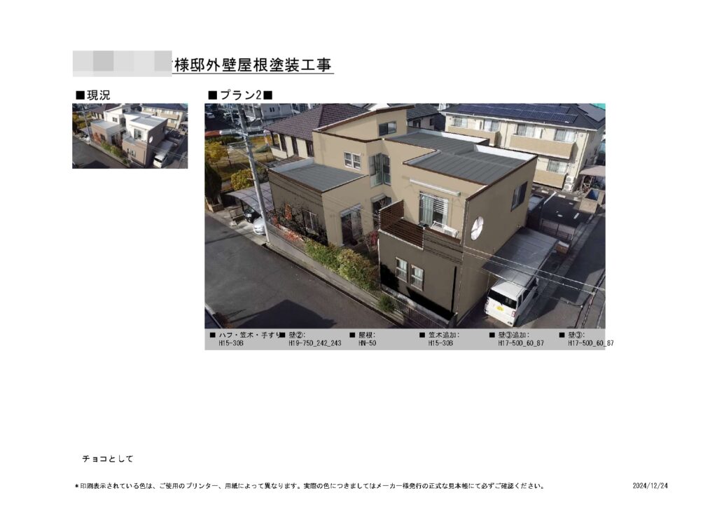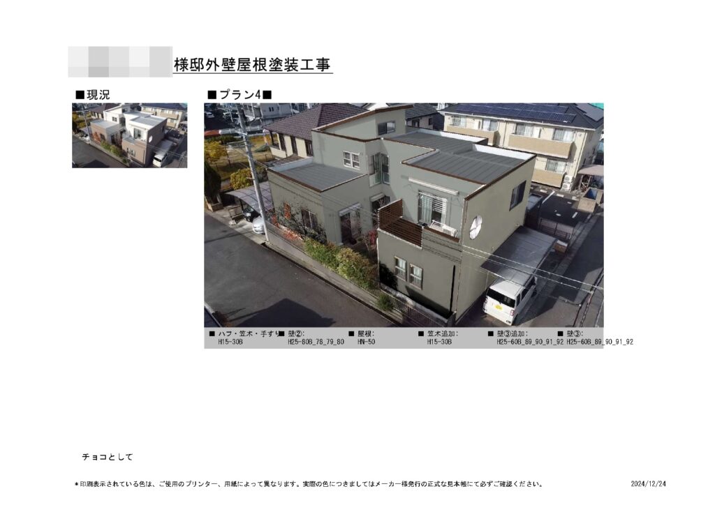 | 使用商材・建材 | 外壁 : 断熱無機ガイナ(特殊セラミック塗料/日進産業)+モルドバスター2000(超抗菌剤) 屋根: 断熱無機ガイナ(特殊セラミック塗料/日進産業)+モルドバスター2000(超抗菌剤) 付帯 : 4Fイージスガード(2液型弱溶剤/無機配合型4フッ化フッ素塗料/CPJ) 目地&開口部 : SRシールH100(超耐久・高耐候シーリング材/サンライズ) 仕上げ材:光触媒プロテクトコーティング/クリスタルシーズン® |