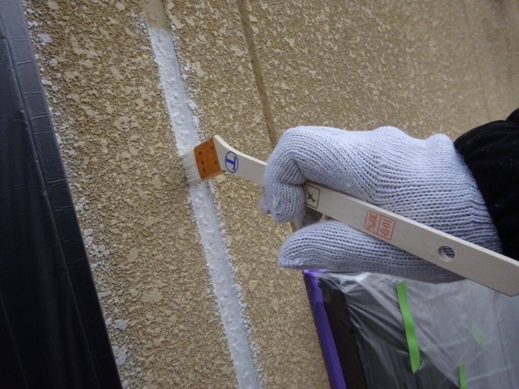 外壁ジョイントはガスケット施工のため、そのまま塗装するとブリード現象が発生するため、ブリードを抑えるブリードオフプライマーをご提案。