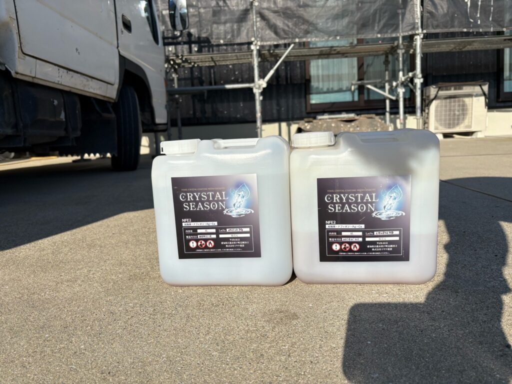 弊社の取り扱っているクリスタルシーズンという光触媒コーティングのご提案もさせて頂きました。こちらは塗料仕上げ剤として最後の工程に外壁や付帯部、などお家全体に吹付けるコーティング材となります。