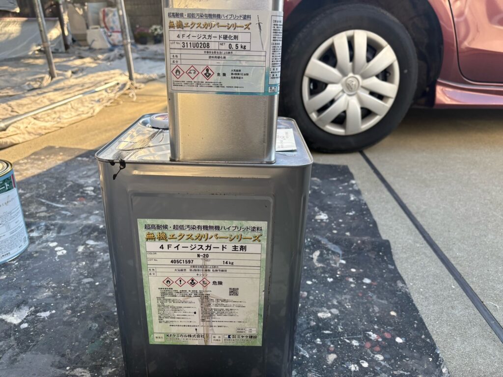 弊社では付帯部に採用しています。耐候性最高峰ともいえる無機成分(オルガノポリシロキサン)と4フッ化フッ素が結合して誕生した、従来のフッ素塗料と比較してメリットが多い塩素フリーの次世代塗料であります。紫外線劣化を防ぎ、付帯部にも優れた付着性、耐候性の実力を発揮してくれます。あの日本ペイントさんが4Fフッ素樹脂が高騰したことによりドゥフロンフッ素に切り替えた中、この4Fイージスガードは4フッ化フッ素にこだわり続けます。