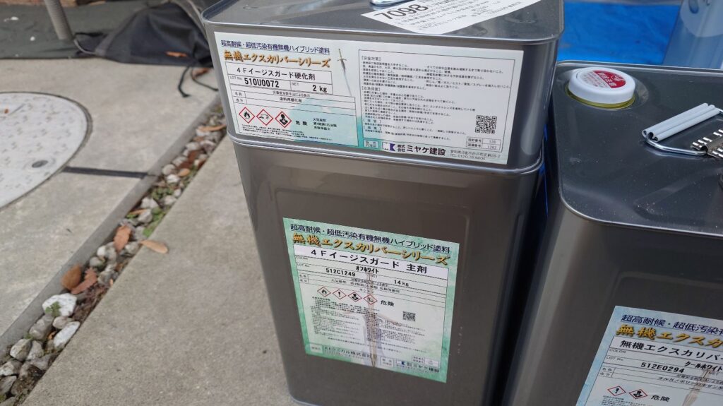 弊社では付帯部に採用しています。耐候性最高峰ともいえる無機成分(オルガノポリシロキサン)と4フッ化フッ素が結合して誕生した、従来のフッ素塗料と比較してメリットが多い塩素フリーの次世代塗料であります。紫外線劣化を防ぎ、付帯部にも優れた付着性、耐候性の実力を発揮してくれます。あの日本ペイントさんが4Fフッ素樹脂が高騰したことによりドゥフロンフッ素に切り替えた中、この4Fイージスガードは4フッ化フッ素にこだわり続けます。