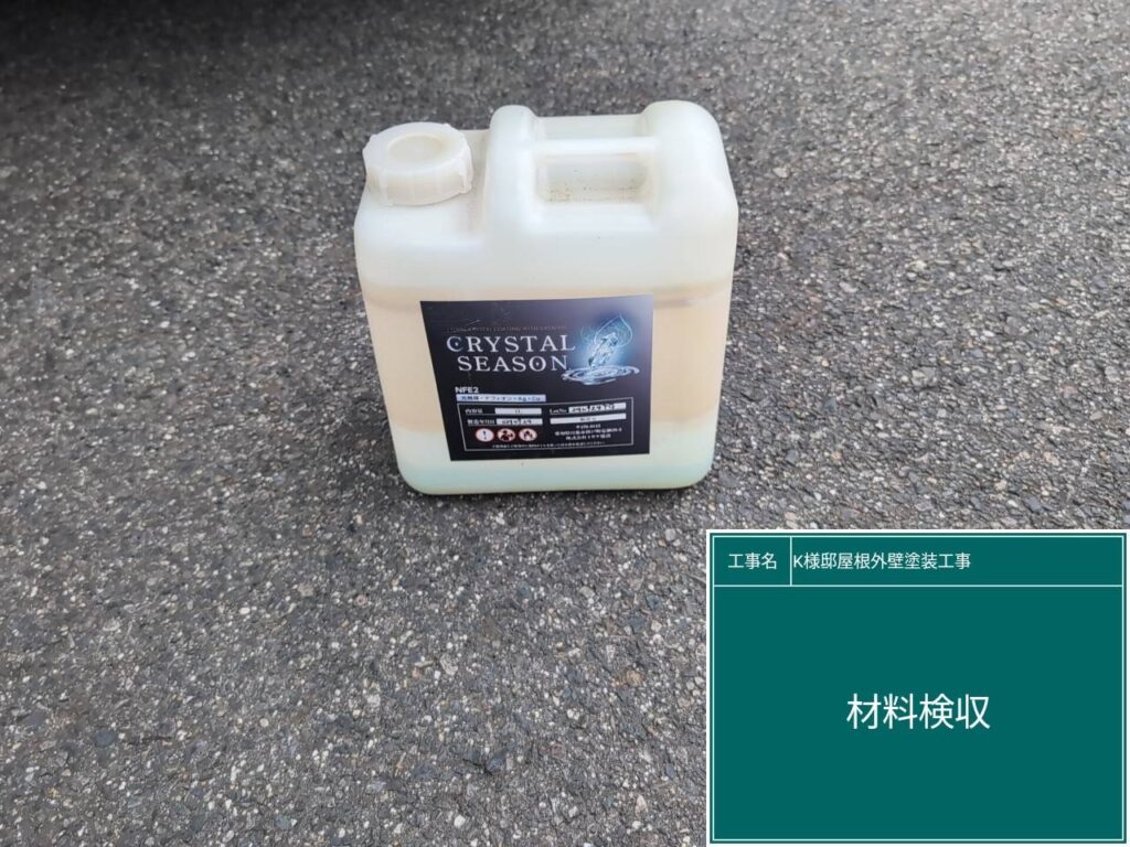 | 使用商材・建材 | 外壁 : 断熱性無機ガイナ(特殊セラミック塗料/日進産業) 屋根 :無機エクスカリバーMZ-R(2液型弱溶剤/バーテックス無機塗料/CPJ・~クリスタルペイントジャパン~) 付帯 : 4フッ化フッ素(2液型弱溶剤/フッ素塗料) 目地&開口部 : SRシールH100(超耐久・高耐候シーリング材/サンライズ) 仕上げ材:光触媒プロテクトコーティング/クリスタルシーズン® |